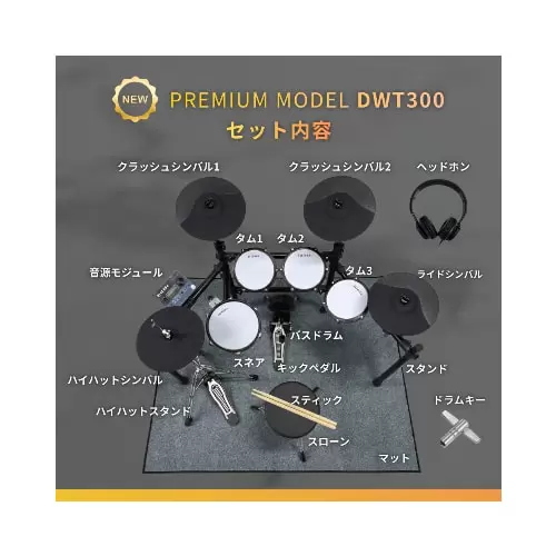 EREDOLA DWT-300は電子ピアノ本体はもちろん、マット・スティック・スローンなど演奏に必要なアクセサリーを一式セットにした初心者の方も安心してお使いいただける本格電子ドラムです。