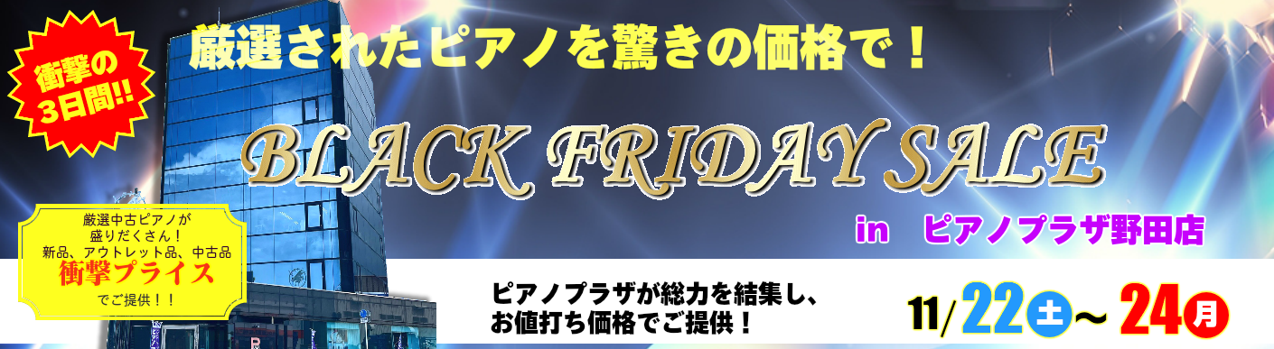 令和7年11月22日(土)24日(月)3日間限定で、千葉県野田市のピアノプラザにて「BLACK FRIDAY セール2025 in 野田ショールーム」を開催致します。充実の品揃えと安さで評判のピアノプラザが総力を結集し、お値打ち価格でご提供致します。国内外の一流メーカーが勢揃い。国産中古ピアノが28万円~!グランドピアノが98万円~と、ピアノがどこよりもお買い得です!