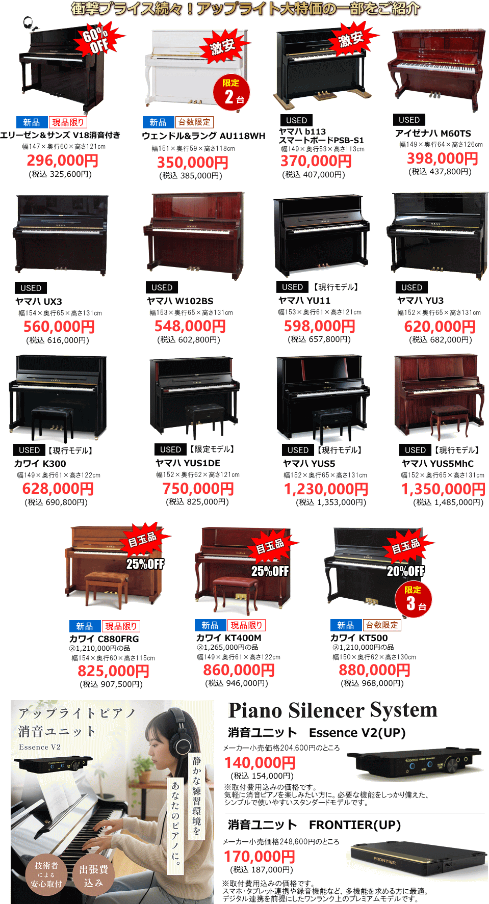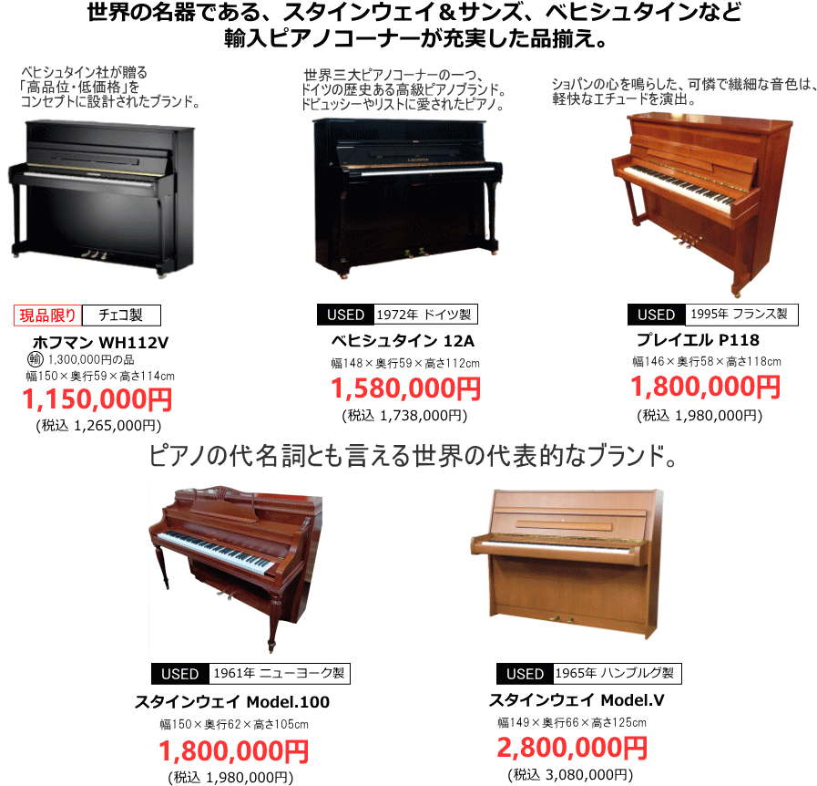 輸入ピアノ大特価多数展示! 付属品サービス付き!